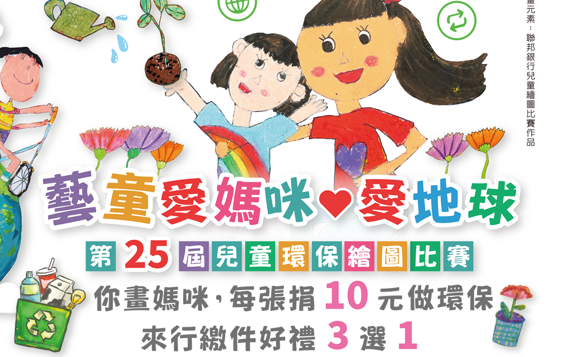 比賽宗旨環境保護人人有責!本次比賽邀請小朋友在母親節前夕,運用各種色彩及技巧的表達,勾勒出與媽咪攜手做環保的生活時光,藉此培養兒童藝術涵養、並從小扎根SDGs永續觀念及推廣聯邦銀行業務。活動主題1.主題:「藝童愛媽咪 ・ 愛地球」,請小朋友以跟媽咪一起做環保、節能減碳為主題,自由發揮彩繪創意。2.媒