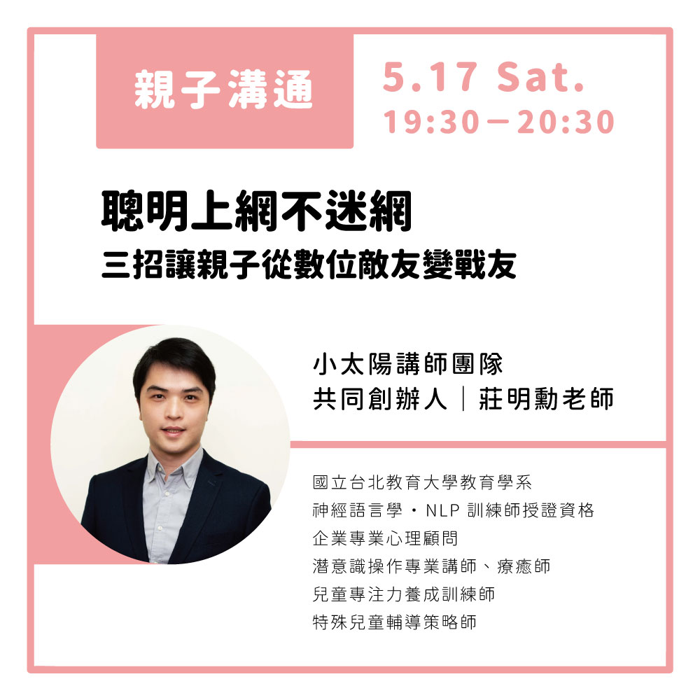 從 4 月至 6 月,目前共有四場親職講座。邀請親職專家/領域職人,來和爸爸、媽媽與老師們,分享在陪伴孩子的過程中會面臨的問題、煩惱與 ✨ 具體的解方 ✨