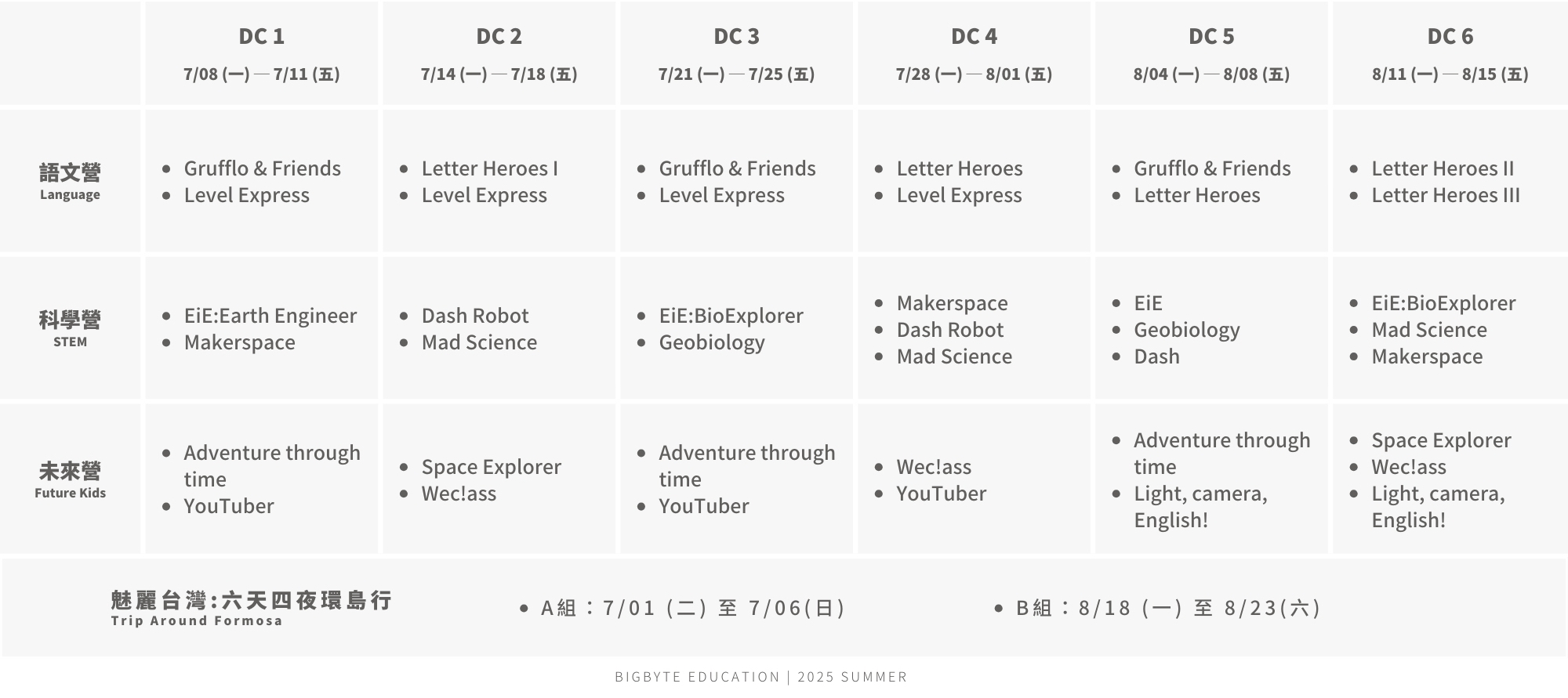 今年,我們將暑期營隊昇華,讓孩子們在學習中探索多元的知識與技能:每一週,我們精心設計了 語文營、科學營、未來營 等多元課程,讓孩子們根據興趣選擇,並在語言、科技及未來領導力等領域全方位發展。