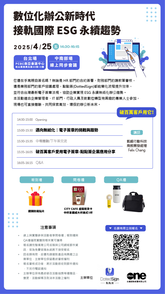 您還在手寫親自簽名嗎?無論是 HR 部門的合約簽署、財務部門的請款單審核,還是業務部門的客戶協議處理,點點簽(DottedSign)都能簡化流程提升效率,並符合台灣最新電子簽章法規,協助企業實現 ESG 永續無紙化辦公趨勢。本活動適合企業管理者、IT 部門、行政人員及對數位轉型有興趣的專業人士參加,現場也可直接體驗,共同探索高效、環保的辦公新未來。
