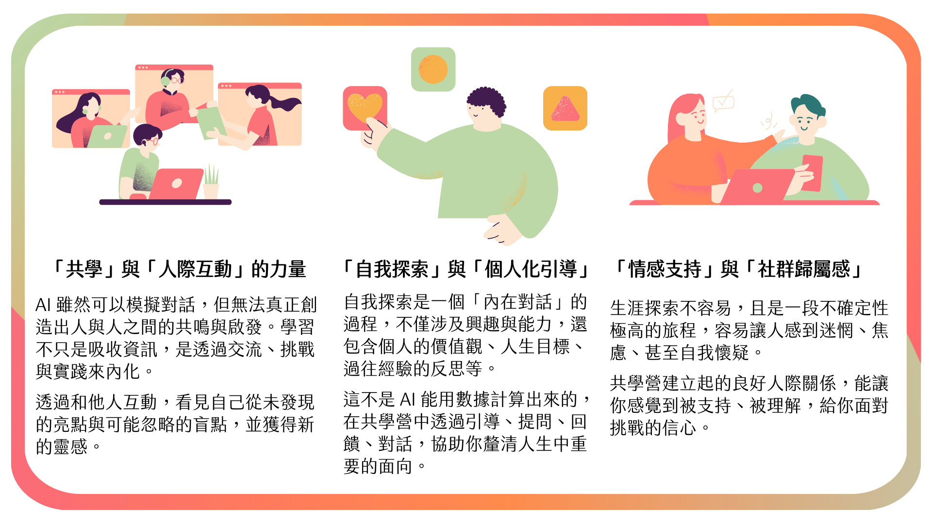 在這裡,你不只是學員,而是共創社群的一員,透過生涯工具練習、經驗交流,獲得陪伴與支持。
