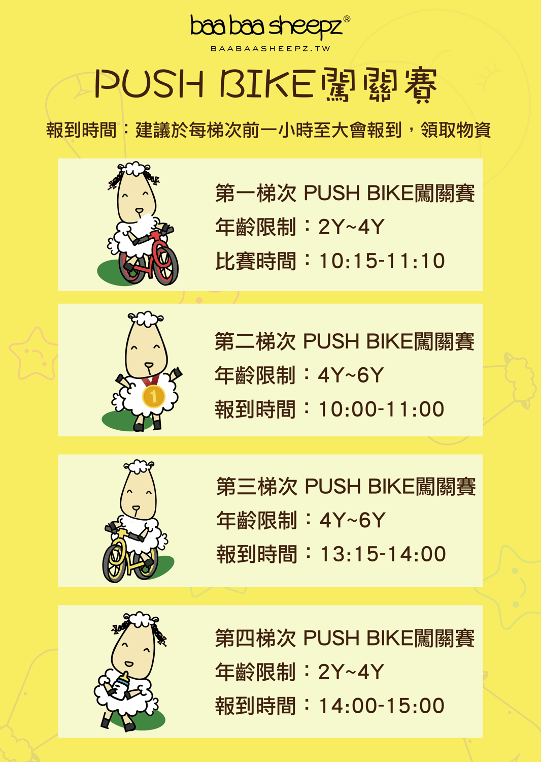 | 14:30-15:00 | 第二梯次小寶寶搬搬樂比賽 | 15:15-16:00 | 第四梯次PUSH BIKE闖關賽比賽 |